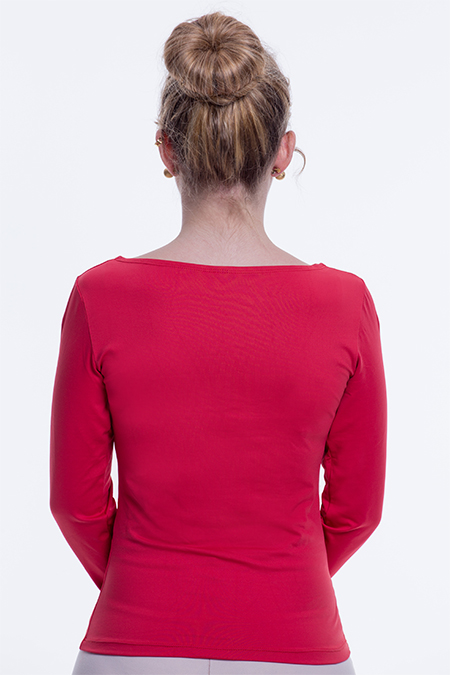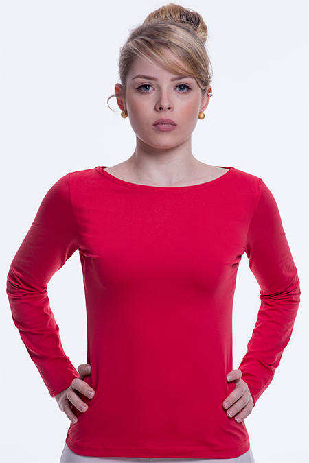 Blusa manga longa decote canoa cores clássicas em tecido LIGHT CO2 (fio AMNI SOUL ECO, o primeiro fio de Nylon 6.6 biodegradável do mundo), com fator de proteção solar 50 UVA e UVB.