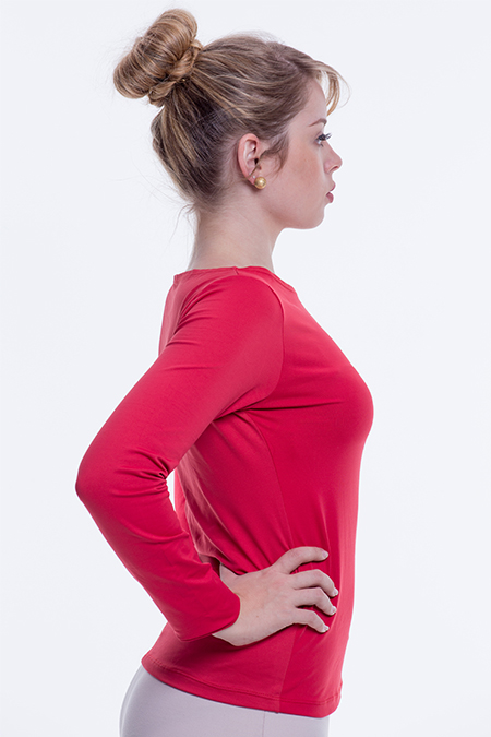 Blusa manga longa decote canoa cores clássicas em tecido LIGHT CO2 biodegradável, com fator de proteção solar 50 UVA e UVB.