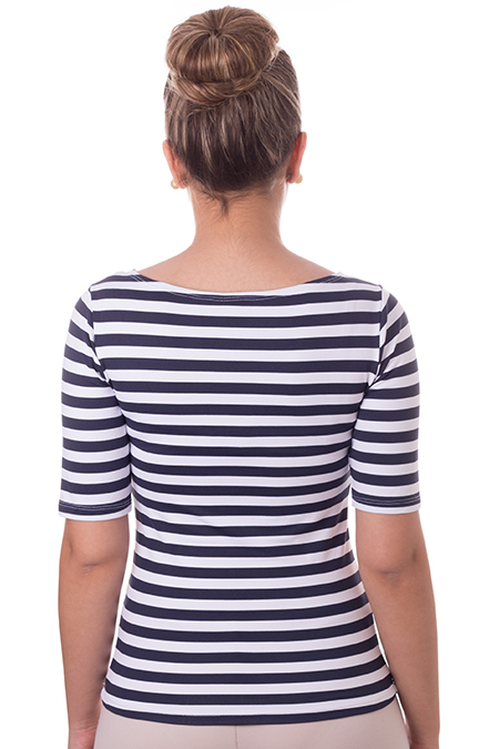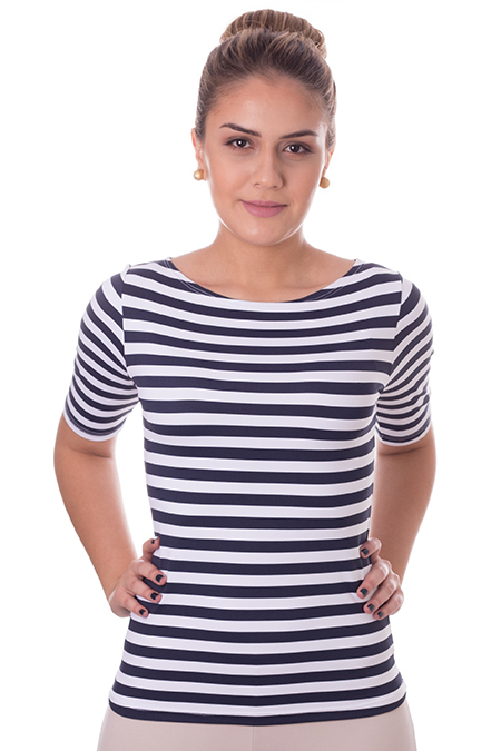 Blusa meia manga decote canoa estampas em tecido LIGHT CO2 biodegradável, com fator de proteção solar 50 UVA e UVB.