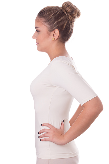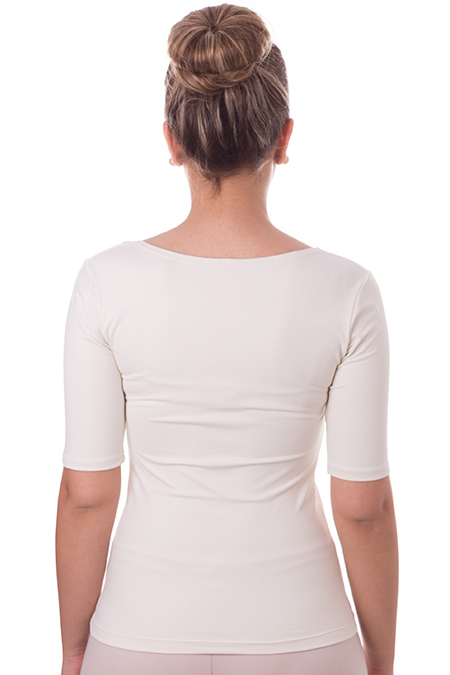 Blusa meia manga decote redondo cores clássicas em tecido LIGHT CO2 biodegradável, com fator de proteção solar 50 UVA e UVB.