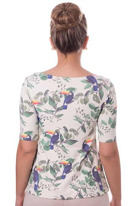 Blusa meia manga decote canoa EVASÊ estampas EXCLUSIVAS em tecido LIGHT CO2  biodegradável, com fator de proteção solar 50 UVA e UVB.