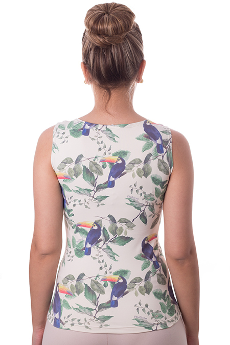 Blusa regata decote canoa estampas EXCLUSIVAS em tecido LIGHT CO2 biodegradável, com fator de proteção solar 50 UVA e UVB.