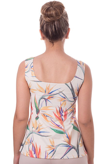 Blusa regata decote redondo EVASÊ estampas EXCLUSIVAS em tecido LIGHT CO2  biodegradável, com fator de proteção solar 50 UVA e UVB.
