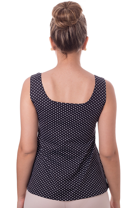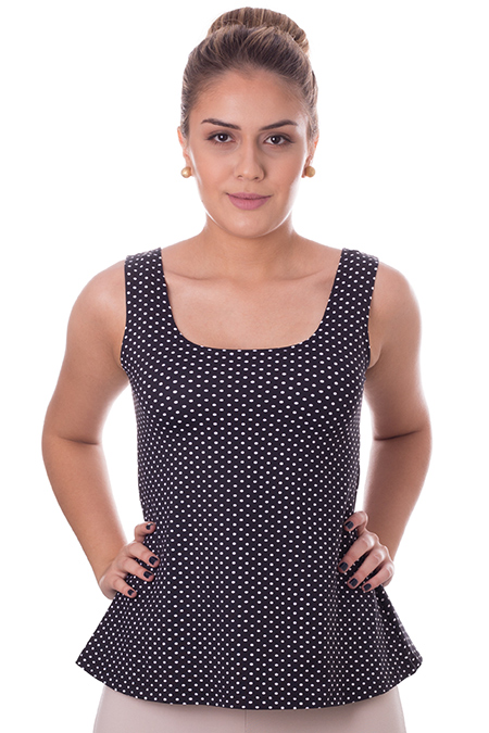 Blusa regata decote redondo EVASÊ cores e estampas em tecido LIGHT CO2 biodegradável, com fator de proteção solar 50 UVA e UVB.